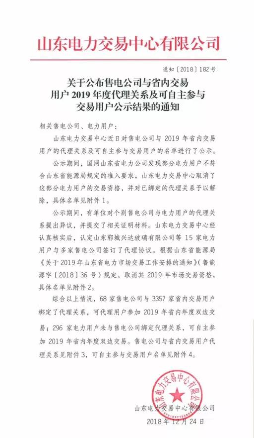 山東關(guān)于公布售電公司與省內(nèi)交易用戶(hù)2019年度代理關(guān)系及可自主參與交易用戶(hù)公示結(jié)果的通知