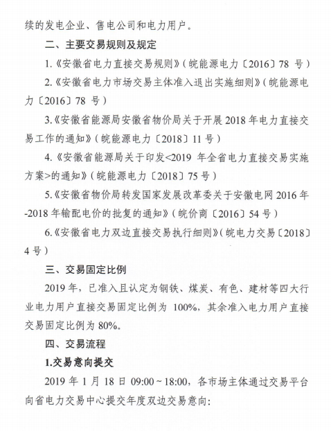 安徽電力交易中心日前發(fā)布了《關于開展安徽省2019年度電力雙邊直接交易的市場公告》,已準入且認定為四大行業(yè)電力用戶直接交易固定比例為100%,其他準入電力用戶直接交易固定比例為80%。