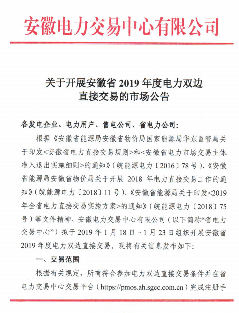 安徽電力交易中心發(fā)布了《關于開展安徽省2019年度電力雙邊直接交易的市場公告》