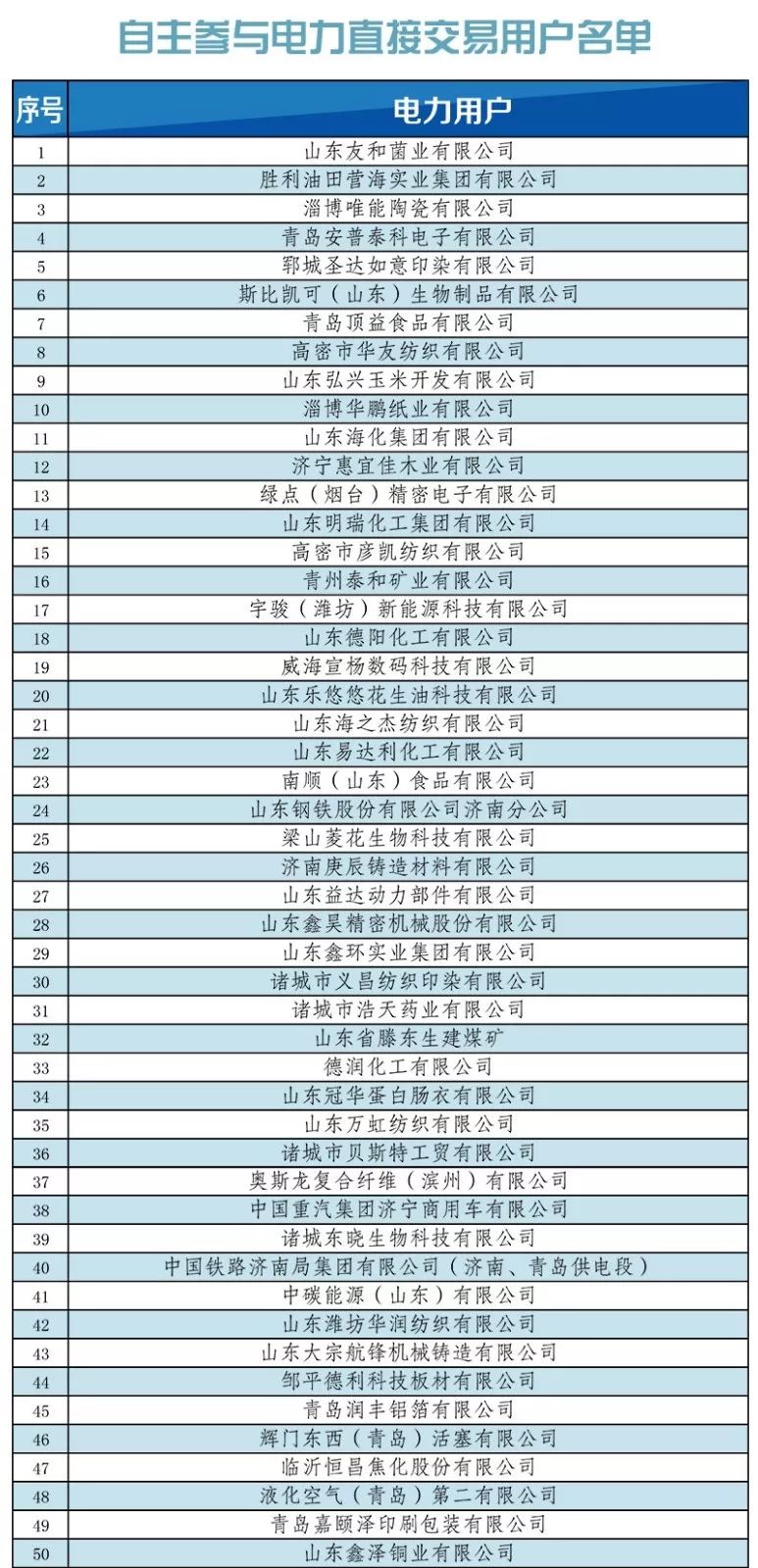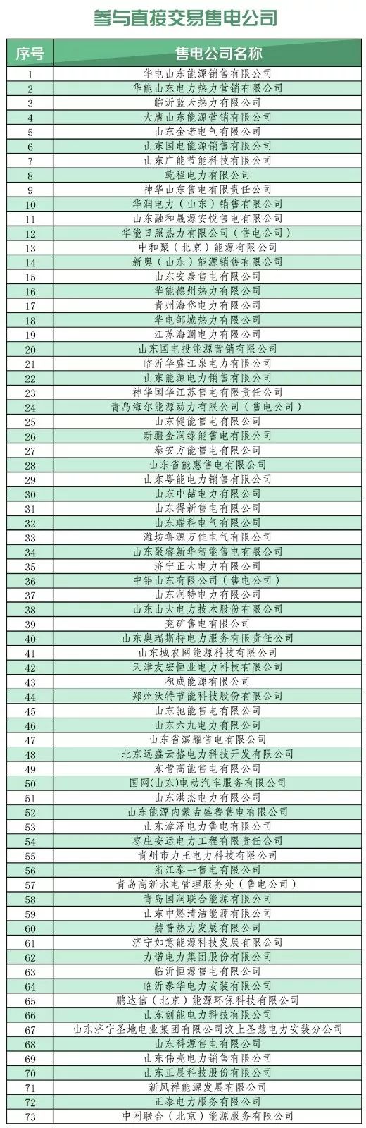 購電方:在山東電力交易中心網(wǎng)站公示通過、完成注冊且已經(jīng)提交有效2019年省內(nèi)電力用戶和銀東直流跨區(qū)交易用戶代理協(xié)議的售電公司;省能源局準許并在山東電力交易中心網(wǎng)站完成注冊、可自主參與2019年省內(nèi)電力直接交易的電力用戶(詳見下表)。