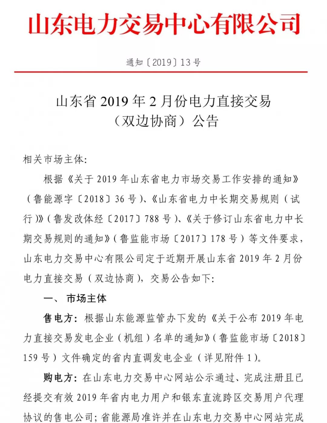 《關(guān)于修訂山東省電力中長期交易規(guī)則的通知》(魯監(jiān)能市場〔2017〕178號)等文件要求,山東電力交易中心有限公司定于近期開展山東省2019年2月份電力直接交易(雙邊協(xié)商)