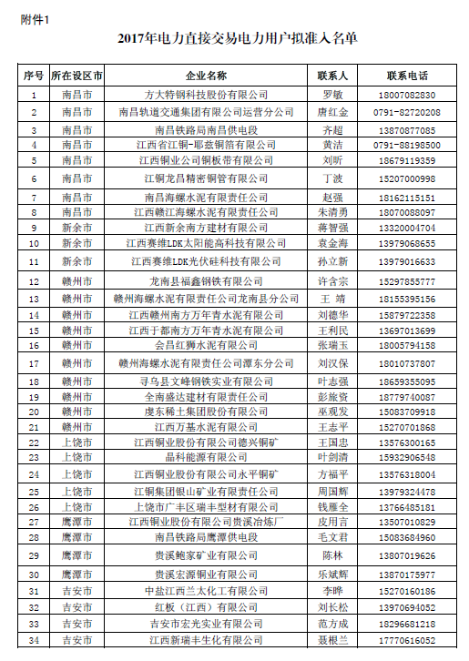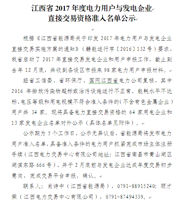 江西省2017年度電力用戶與發(fā)電企業(yè)直接交易資格準入名單公示