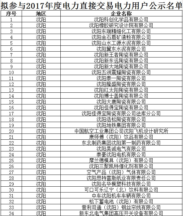遼寧省經(jīng)信委7月6日發(fā)布了《關于擬參與2017年度電力直接交易電力用戶準入名單的公示》,本次新增電力用戶準入名單公示分兩批進行,初步確定新增沈陽科創(chuàng)化學品有限公司等第一批206戶企業(yè)參與本年度電力直接交易,
