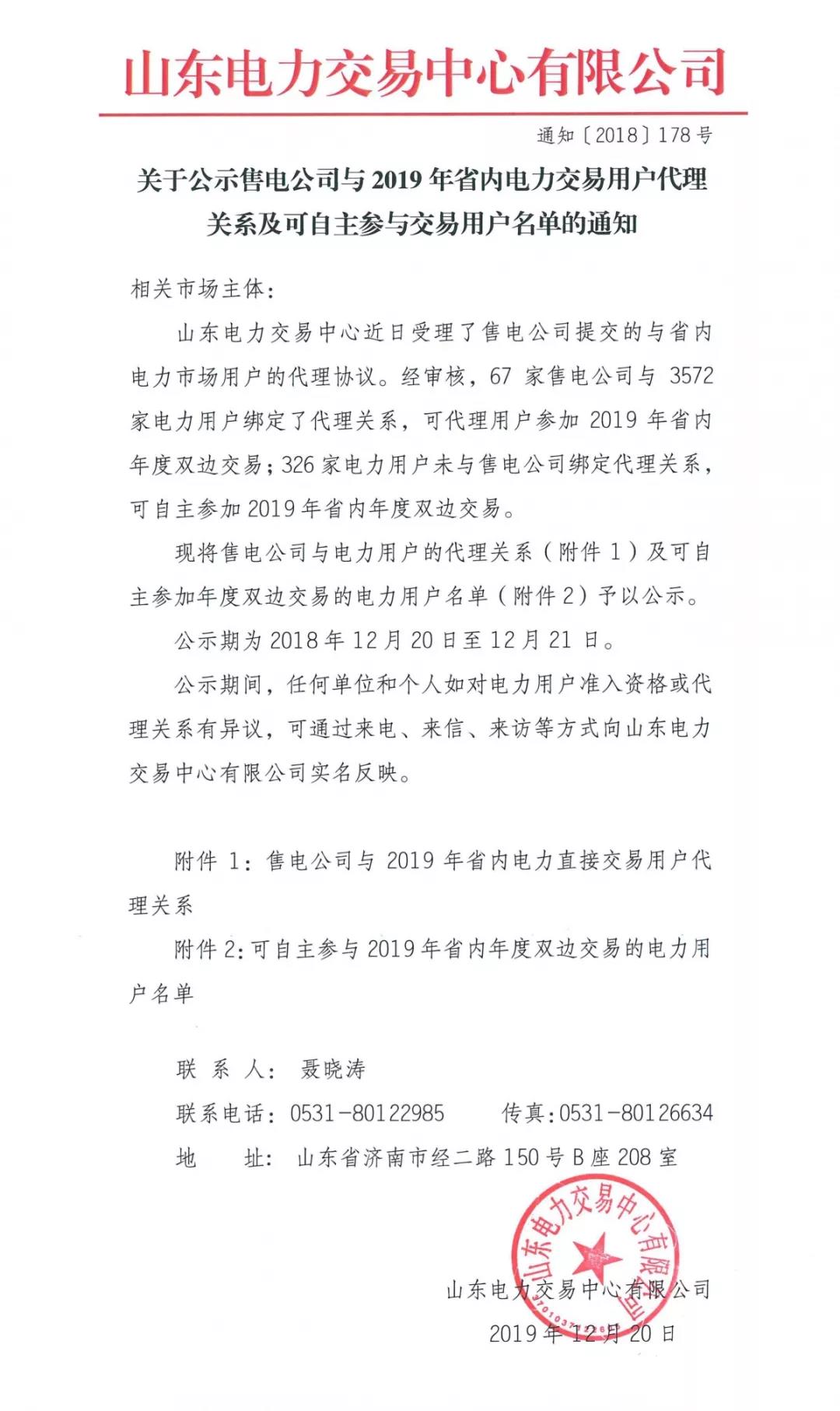 山東關(guān)于公示售電公司與2019年省內(nèi)電力交易用戶代理關(guān)系及可自主參與交易用戶名單的通知
