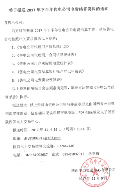 11月10日,陜西電力交易中心發(fā)布了《關(guān)于報送2017年下半年售電公司電費》,按照相關(guān)要求報送以下資料: