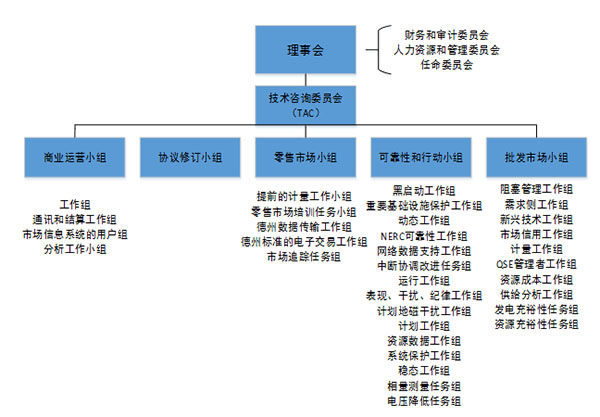 ERCOT是一個受德州公共事業(yè)委員會(Public Utility Commission of Texas,PUCT)和德州立法機構(gòu)監(jiān)管的非盈利企業(yè),由董事會直接管理,并采用會員制。董事會由獨立會員、消費者以及ERCOT電力市場各部門代表組成。技術(shù)顧問委員會通過其五個附屬委員會以及多個任務(wù)小組和特別小組的協(xié)助為董事會提供政策建議。ERCOT的成員包括普通用戶、合作企業(yè)、發(fā)電企業(yè)、電力市場營銷人員、電力零售商、私有電力企業(yè)(輸配電供應(yīng)商)以及國有電力企業(yè)。