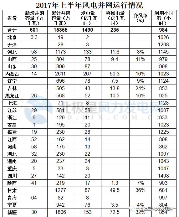 國家能源局昨日公布了2017年上半年風電并網(wǎng)運行情況。上半年全國風電新增并網(wǎng)容量601萬千瓦,截至6月底,累計并網(wǎng)容量達到1 54億千瓦,同比增長12%;平均利用小時數(shù)984小時,同比增加67小時;風電棄風電量235億千瓦