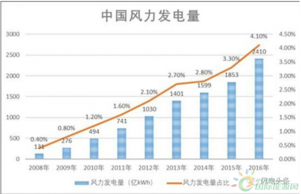 根據(jù)中國風(fēng)能協(xié)會(huì)的統(tǒng)計(jì),2016年我國風(fēng)電累計(jì)并網(wǎng)容量148.64GW,同比增長15%,風(fēng)力發(fā)電量2410億kWh,同比增長30%,占全部發(fā)電量的4.1%,同比提升0.8%,風(fēng)力發(fā)電的市場份額進(jìn)一步提升,風(fēng)電已成為我國繼煤電、水電之后的第三大電源。
