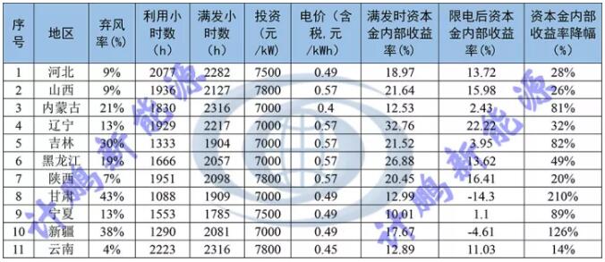由上表可以看出,隨著棄風率的增大,項目的經濟收益呈下降趨勢。以資本金內部收益率10%為最低投資基準,其中,內蒙、吉林、甘肅、寧夏、新疆在限電后項目收益在基準收益率以下,這些省份資本金內部收益率降幅均在81%以上。此外,黑龍江、遼寧、河北、陜西等省份因棄風原因,資本金內部收益率降幅平均為31%,對項目經濟效益的影響較大。