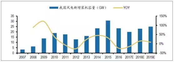 2015年全國風電裝機出現(xiàn)搶裝,新增風電裝機32GW,隨后的2016年和2017年國內風電裝機同比出現(xiàn)下滑(預計2017年新增風電裝機約20GW,同比下滑)。