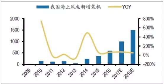 2016年,中國海上風電新增裝機(吊裝量)154臺,容量達到59萬千瓦,同比增長64%,累計裝機量達到163萬千瓦。預計2017年海上風電裝機約為100萬千瓦,同比增長超過60%,明年同比增長將超過50%。同時預計今年海上風電項目的招標量有望超過300萬千瓦。
