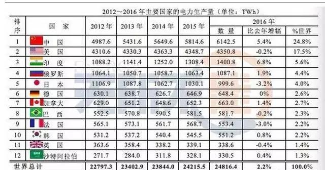 以下是2012--2016年世界主要國(guó)家電力生產(chǎn)排名: