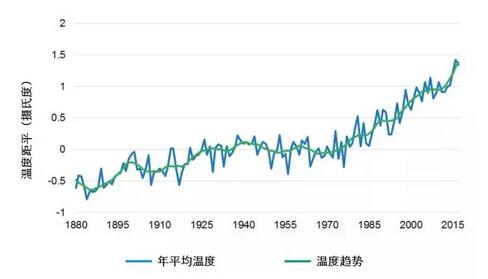 自1880年起的全球平均溫度距平(與整體平均值差值)