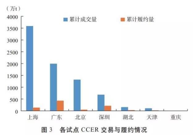 為降低履約成本,七個試點均允許企業(yè)使用一定比例的CCER用于抵消排放,抵消比例在5%~10%之間,并進一步對項目類型、時間和地域等進行限制。雖然CCER于2015年初才開始上市交易,但市場供需兩旺、交易較活躍。截至2016年12月底,累計交易量達到7933.96萬t。交易活動相對集中于上海和廣東,分別占總量的45%和25%,見圖3。據(jù)調(diào)研統(tǒng)計,CCER價格依項目類型、履約適用性以及區(qū)域而不同,價格區(qū)間為1~30元/t,多數(shù)交易價格在10元/t以下。對CCER最大的需求來自試點履約,截至2016年履約期,各試點累計履約上繳955.1萬tCCER,其中廣東占比46%。