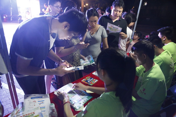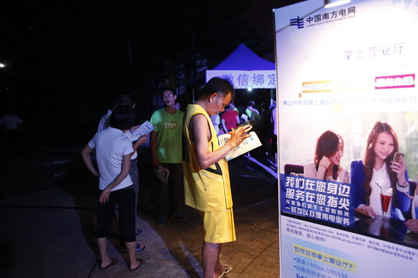 微同行活動(dòng)走進(jìn)社區(qū),吸引社區(qū)居民踴躍參與。藍(lán)日英 攝用戶自己對(duì)著宣傳單張?zhí)崾具M(jìn)行手機(jī)綁定戶號(hào)。藍(lán)日英活動(dòng)現(xiàn)場(chǎng)吸引很多客戶參與戶號(hào)綁定  本網(wǎng)訊 8月14日晚上,佛山高明供電局走進(jìn)大型住宅小區(qū)寶行御泉灣
