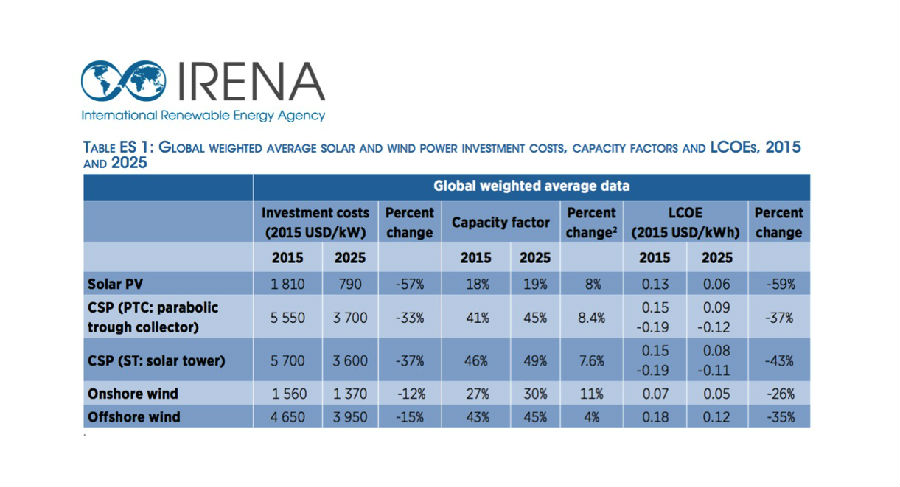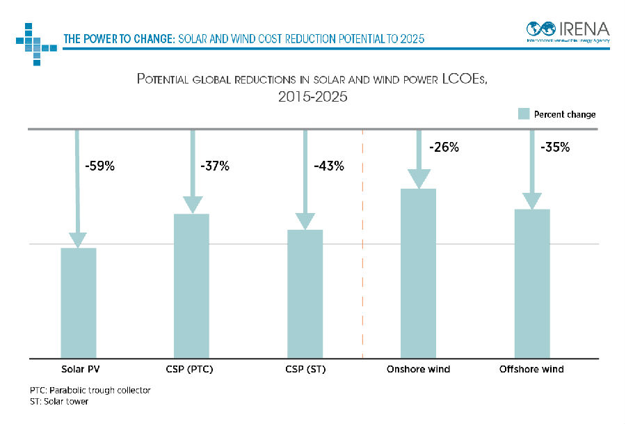 根據(jù)國(guó)際可再生能源署(IRENA)發(fā)布的報(bào)告預(yù)測(cè),光伏、光熱、陸上和海上風(fēng)電成本將大幅度下降,到2025年的十年期間,度電成本將分別下降26%-59%不等。
