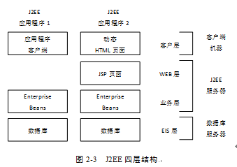 J2EE使用多層的分布式應(yīng)用模型,能夠為不同的服務(wù)提供獨立的層:客戶層(client tier)在客戶端機器上運行,包括Html頁面,客戶端應(yīng)用程序支持HTTP協(xié)議;Web層(WEB tier)在J2EE應(yīng)用服務(wù)器上運行,Web層組件主要指Jsp,Java servlet等WEB部件;業(yè)務(wù)層也稱為企業(yè)組件層,在J2EE應(yīng)用服務(wù)器上由EJB容器運行,支持EJB、JMS、JTA 等服務(wù)和技術(shù),因此也叫EJB tier;企業(yè)信息系統(tǒng)層(EIS tier),EIS的數(shù)據(jù)層主要特點是有數(shù)據(jù)庫的支持,它在EIS服務(wù)器上運行,處理企業(yè)信息系統(tǒng)軟件。J2EE典型四層結(jié)構(gòu),如圖2-3所示: