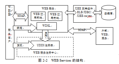 WEB Services是SOA的實現(xiàn)平臺。SOA服務(wù)的主要表現(xiàn)形式是WEB services即WEB服務(wù), Web Services采用對象/組件技術(shù)、使用標(biāo)準(zhǔn)的Internet協(xié)議,具有比任何現(xiàn)有的對象技術(shù)更好的開放性。目前,WEB服務(wù)己成為SOA的主要技術(shù)。WEB services的描述語言WSDL,發(fā)現(xiàn)和集成協(xié)議UDDI,簡單對象訪問協(xié)議SOAP,構(gòu)成了WEB services最基本的技術(shù)規(guī)范。WEB services的運行方式與SOA的設(shè)計思想也是基本類似的,WEB Services的結(jié)構(gòu),見圖2-2。