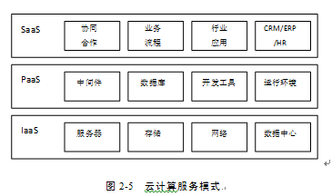 云計算有三種服務(wù)模式:軟件即服務(wù)(SaaS)、平臺即服務(wù)(PaaS)、基礎(chǔ)架構(gòu)即服務(wù)(IaaS)。云計算的服務(wù)模式,見圖2-5所示。