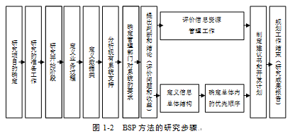 BSP (企業(yè)系統(tǒng)規(guī)劃法,Business System Planning)方法由IBM公司提出,用于幫助制定大型信息系統(tǒng)的規(guī)劃,BSP的研究步驟如圖1-2所示。