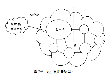 云計算有三種部署類型:公用云(Public Cloud)、私有云(Private Cloud)、混合云(Hybrid Cloud)。云計算部署模型,如圖2-4所示。
