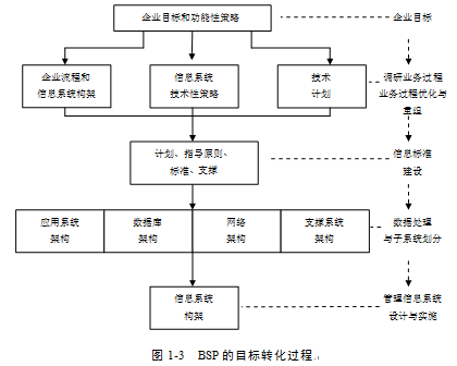 BSP方法的基本思路是:要求所建立的信息系統(tǒng)支持企業(yè)目標(biāo);表達(dá)所有管理層次的要求;向企業(yè)提供一致性信息;對組織機構(gòu)的變革具有適應(yīng)性實質(zhì)。即把企業(yè)目標(biāo)轉(zhuǎn)化為信息系統(tǒng)戰(zhàn)略的全過程。