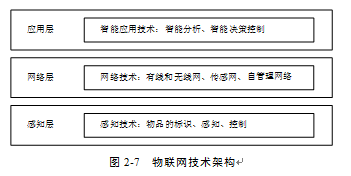 物聯(lián)網(wǎng)的技術(shù)架構(gòu)包括應(yīng)用層、網(wǎng)絡(luò)層和感知層。應(yīng)用層是物聯(lián)網(wǎng)和用戶的接口,實現(xiàn)物聯(lián)網(wǎng)的智能應(yīng)用;網(wǎng)絡(luò)層(也稱為傳輸層)由各種網(wǎng)絡(luò)和管理系統(tǒng)組成,負(fù)責(zé)傳遞和處理感知層獲取的信息;感知層由各種傳感設(shè)備和網(wǎng)關(guān)組成,包括RFID標(biāo)簽和讀寫器、溫度傳感器、二氧化碳濃度傳感器、濕度傳感器、攝像頭、GPS、二維碼標(biāo)簽等感知終端,主要作用是物體的識別、信息的采集和簡單處理。物聯(lián)網(wǎng)技術(shù)架構(gòu),如圖2-7所示。