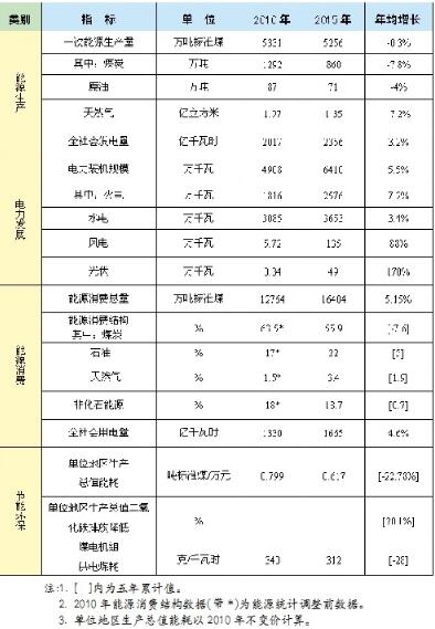 注:1.[]內(nèi)為五年累計值。2.2010年能源消費結(jié)構(gòu)數(shù)據(jù)(帶*)為能源統(tǒng)計調(diào)整前數(shù)據(jù)。3.單位地區(qū)生產(chǎn)總值能耗以2010年不變價計算。