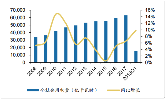 2008年-2018年Q1全社會(huì)用電量和同比增速