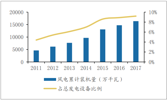 2011年-2017年風(fēng)電累計(jì)裝機(jī)和占比