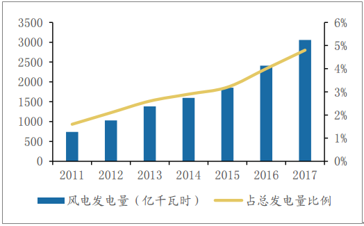 2011年-2017年風(fēng)電發(fā)電量和占比