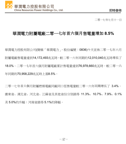 華潤(rùn)電力2017年前6月售電量增加8.5%