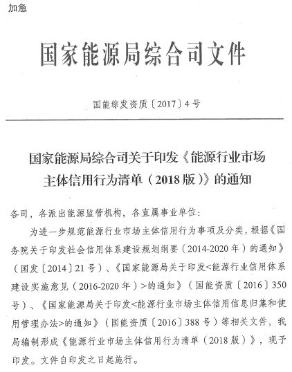 能源局發(fā)布《能源行業(yè)市場(chǎng)主體信用行為清單(2018版)》