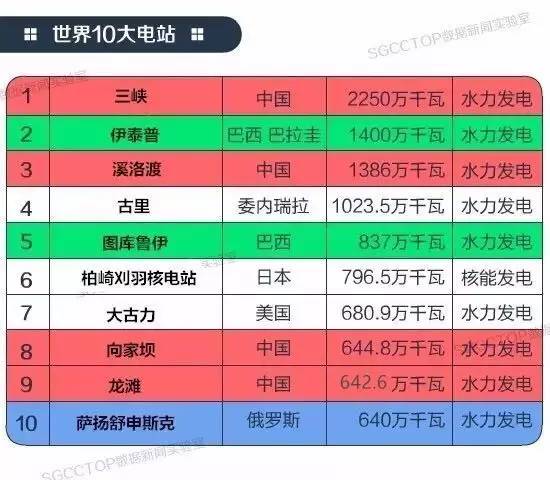 7家發(fā)電站,有4家屬于中國(guó),其中就有大名鼎鼎的三峽。巴西有2家,包括和巴拉圭共有的伊泰普水電站。俄羅斯有1家上榜,印度和南非沒(méi)有發(fā)電站上榜。